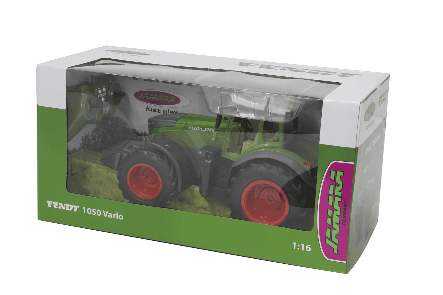 Deze prachtige Fendt 1050 trekker van Jamara is radiografisch bestuurbaar deze kan gecombineerd worden met een bijpassende trailer en hooimachine .