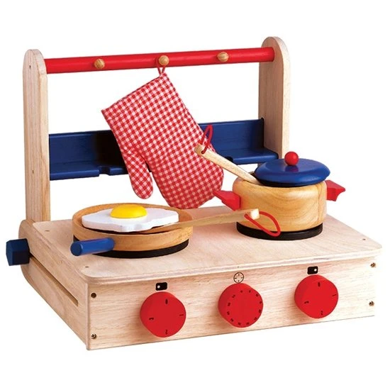 Incl. toebehoren; ovenhandschoen, koekenpan met ei, kookpan en houten lepels. De knoppen maken een “klikkend” geluid bij het draaien.