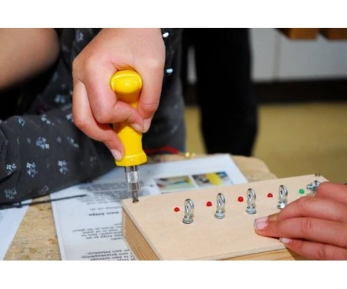 Speciaal voor kinderen ontwikkelde schroevendraaier met 6 bitjes.