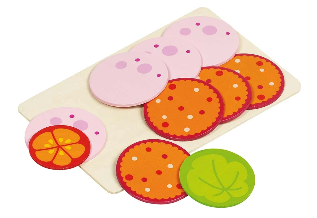 De set bestaat uit: 8 schijfjes worst / vleeswaren, een blaadje sla en een schijfje tomaat..