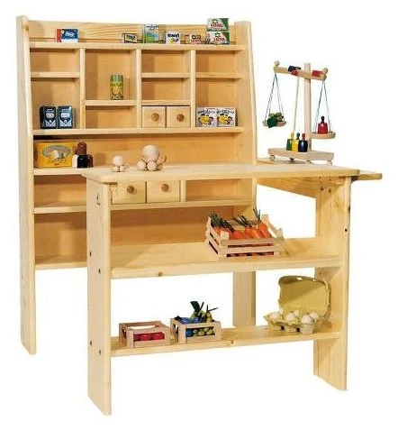 Deze speel-winkel van Pinolino heeft een backstand met gekoppelde verkoopbalie