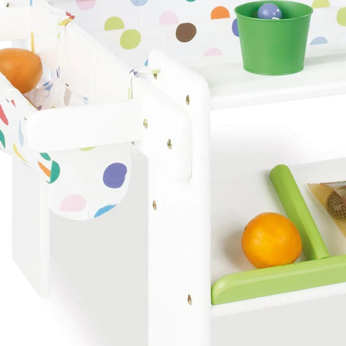 De meest uitgebreide winkel / marktkraam van het robuuste duitse merk Pinolino. De ombouw is gemaakt uit gelakt vurenhout, en de winkel is verder afgewerkt met 100% katoenen bekleding. De winkel wordt geleverd met 4 grote laden en is uiterst stabiel.